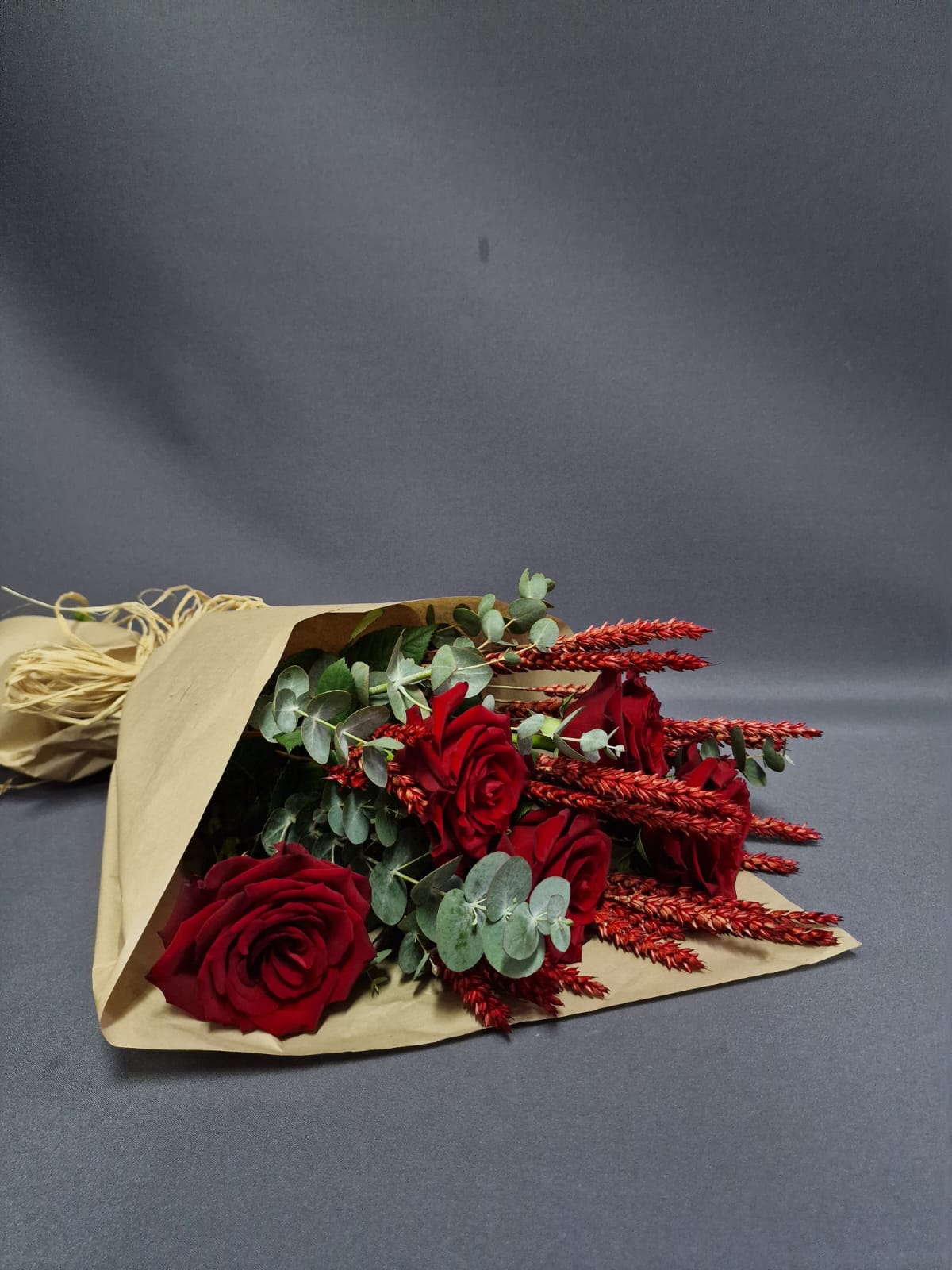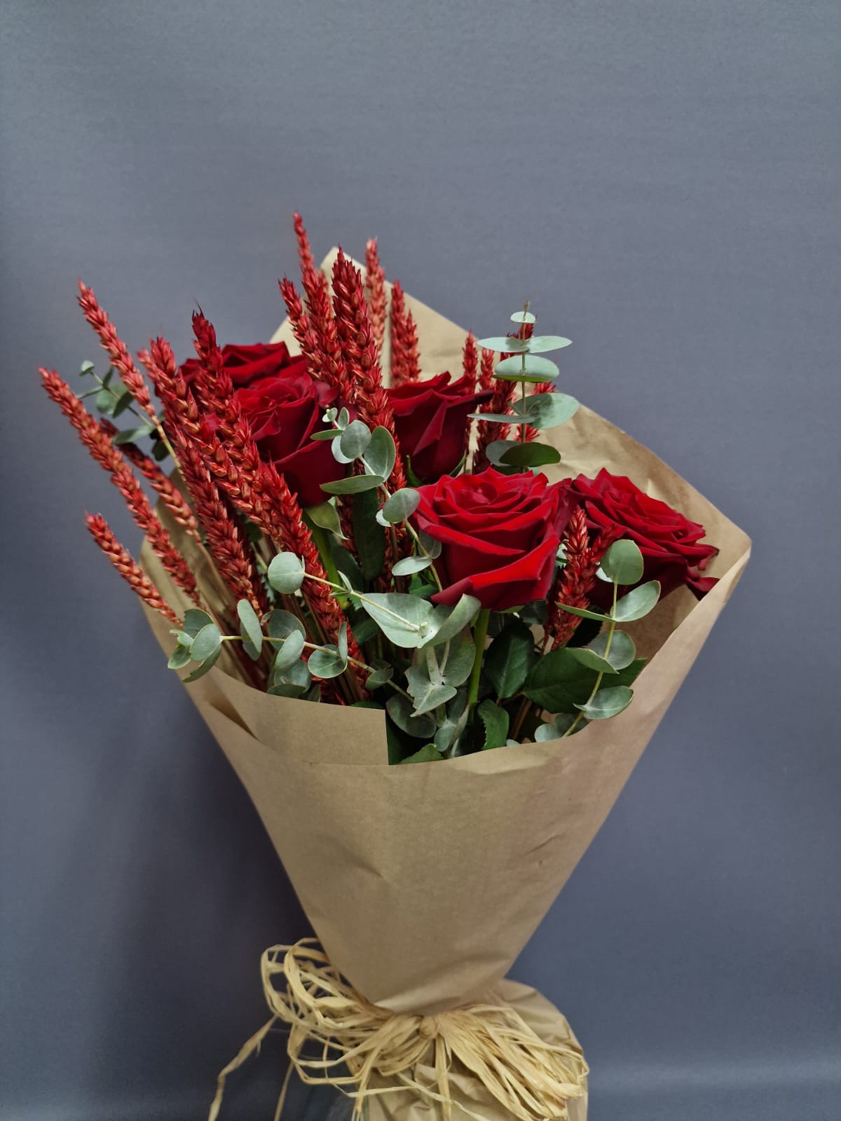 A special bouquet combining 5 red roses with natural wheat and eucalyptus. Rustic elegance meets romance in a gift full of character.