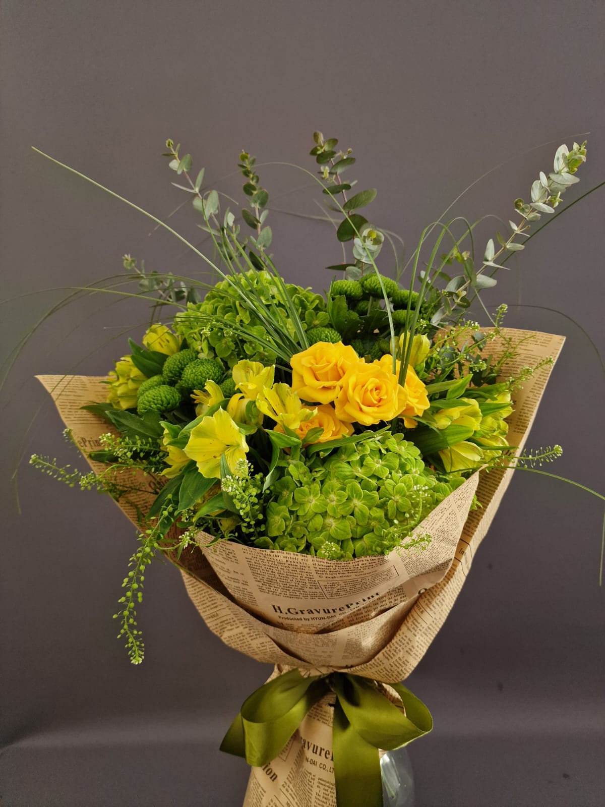A vibrant mix of hydrangea, roses, alstroemeria, chrysanthemums and eucalyptus in yellow and green shades. Fresh, uplifting and full of life.