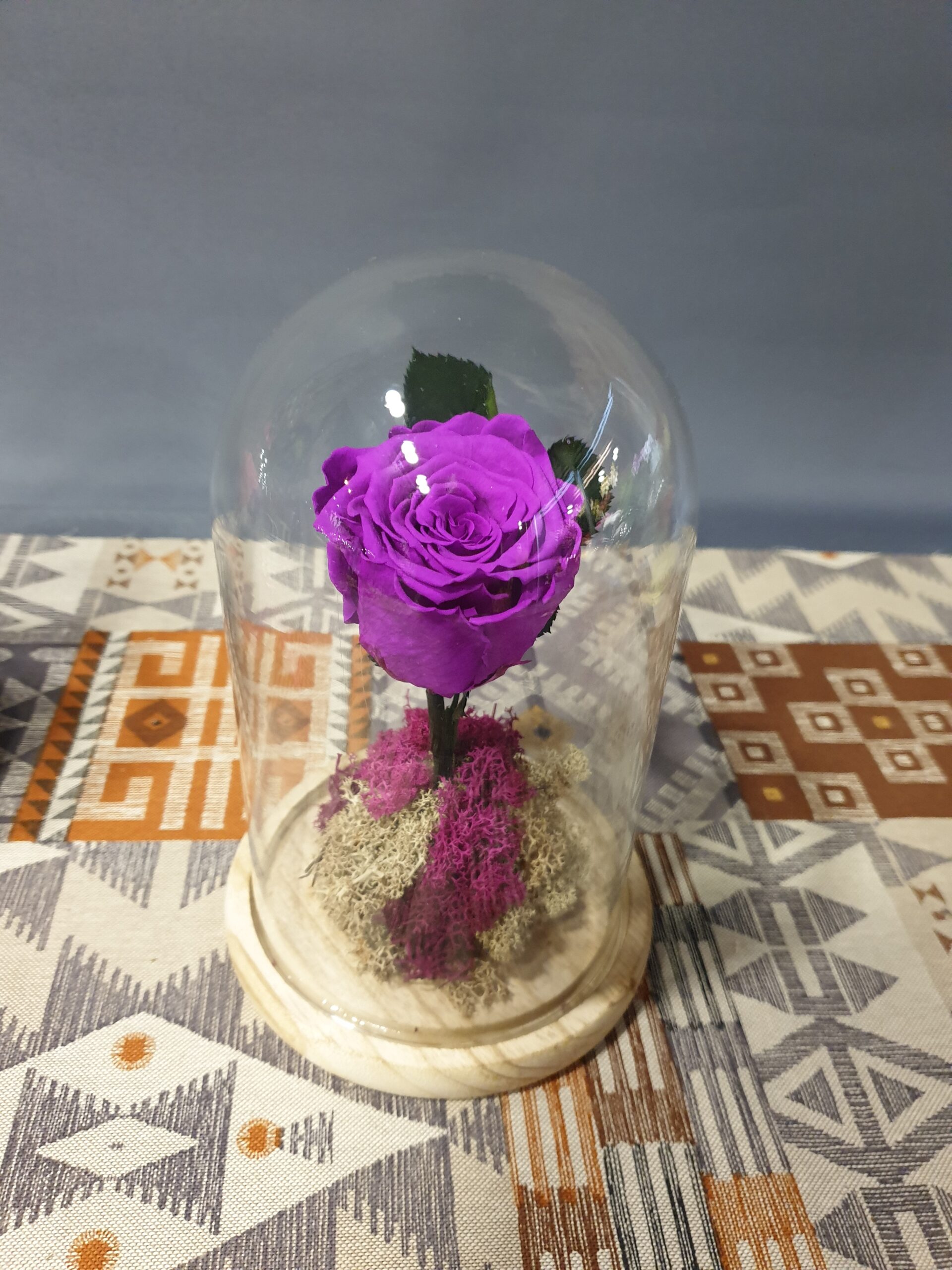 Violet juiced rose in a glass dome ~ 16hx12d.