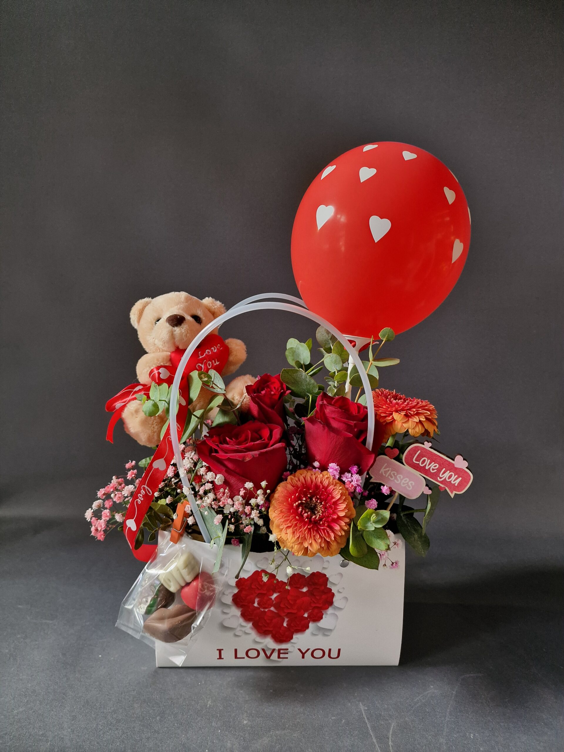 A white I Love you bag offers love red roses, orange germini, balloon, chocolates, love you stick, teddy bear stick