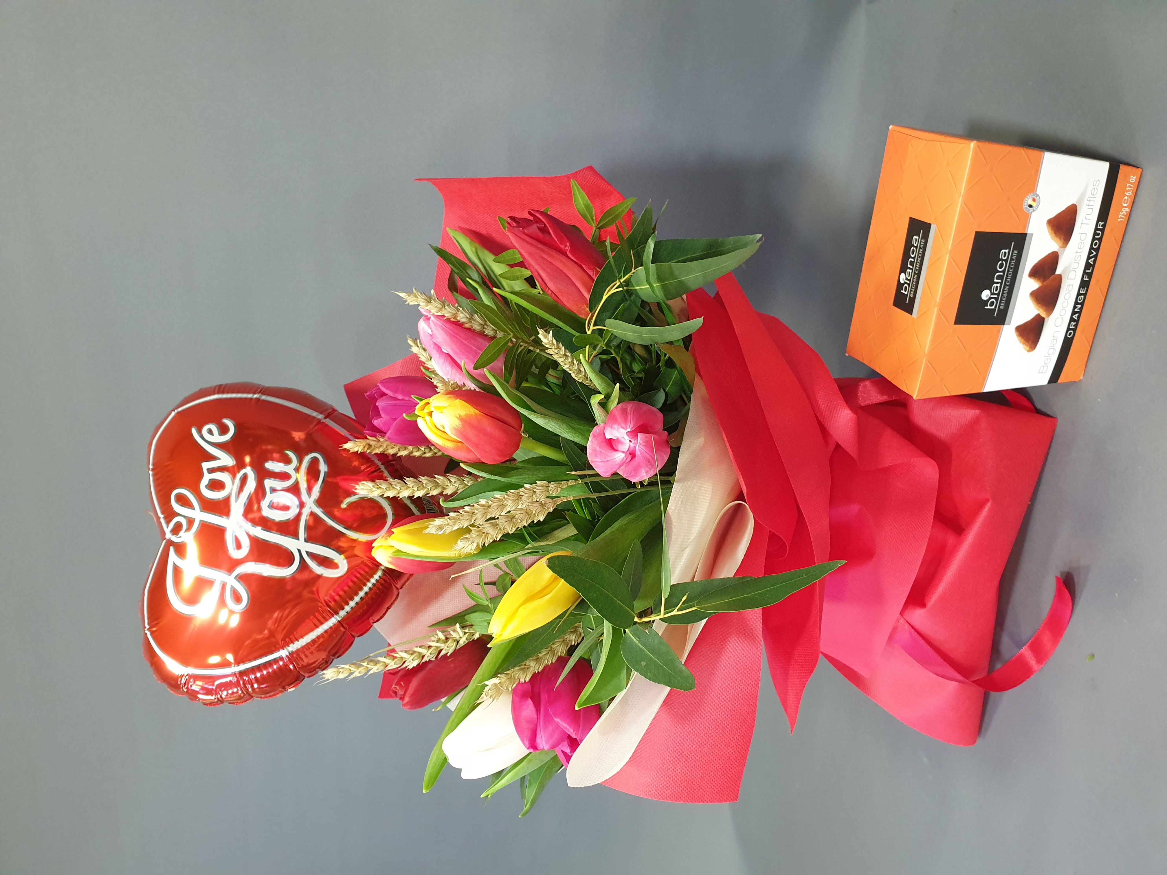 Μπουκέτο με τουλίπες σε διαφορετικά χρώματα, διακοσμητικά στάχυα σε ωραίο περιτύλιγμα ένα μπαλόνι Love για την αγάπη σας και ένα κουτί σοκολατάκια